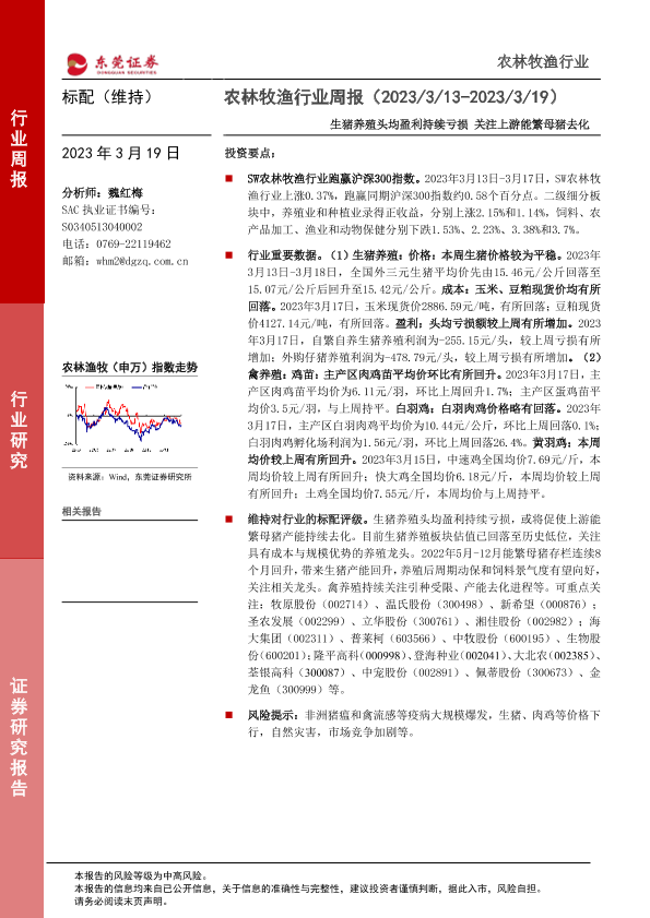 【东莞证券】【20230319】20230319-东莞证券-农林牧渔行业周报:生猪养殖头均盈利持续亏损 关注上游能繁母猪去化-10页