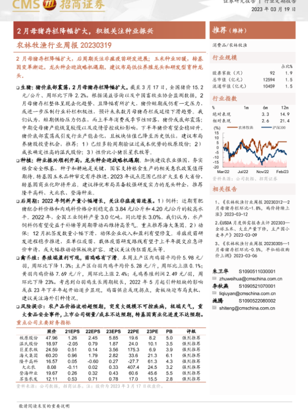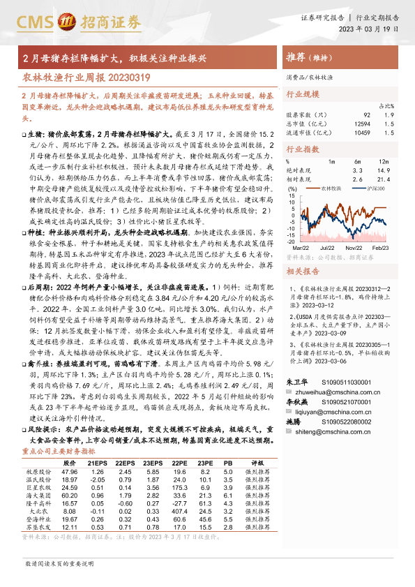 【海通证券】【20230319】20230319-招商证券-农林牧渔行业周报:2月母猪存栏降幅扩大,积极关注种业振兴-15页