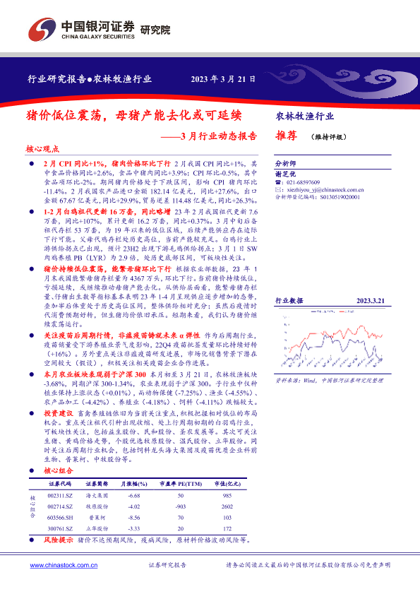【银河证券】【20230321】20230321-中国银河-农林牧渔行业3月行业动态报告:猪价低位震荡,母猪产能去化或可延续-22页