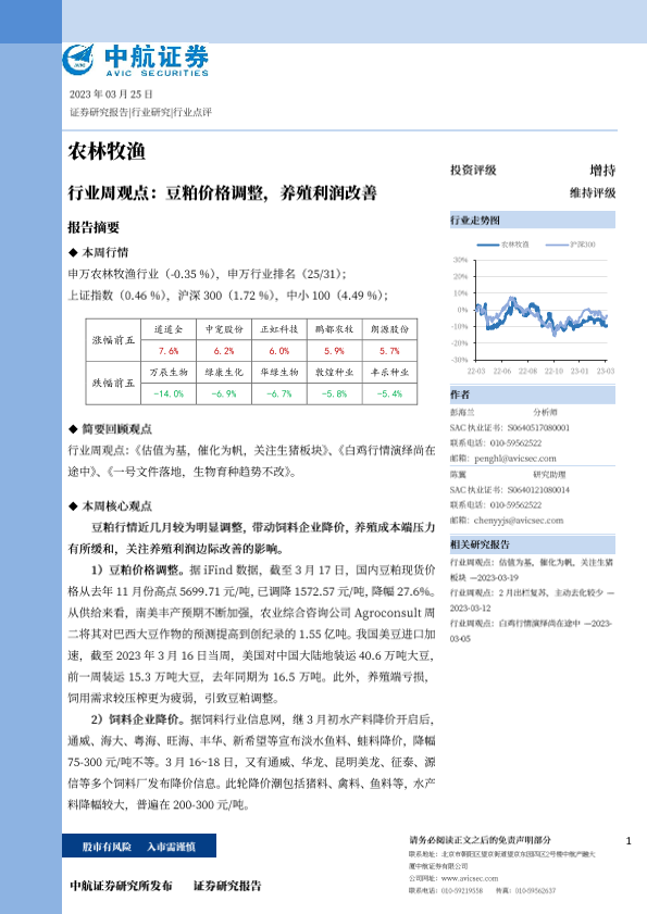 【中航证券】【20230325】农林牧渔行业周观点:豆粕价格调整,养殖利润改善-14页