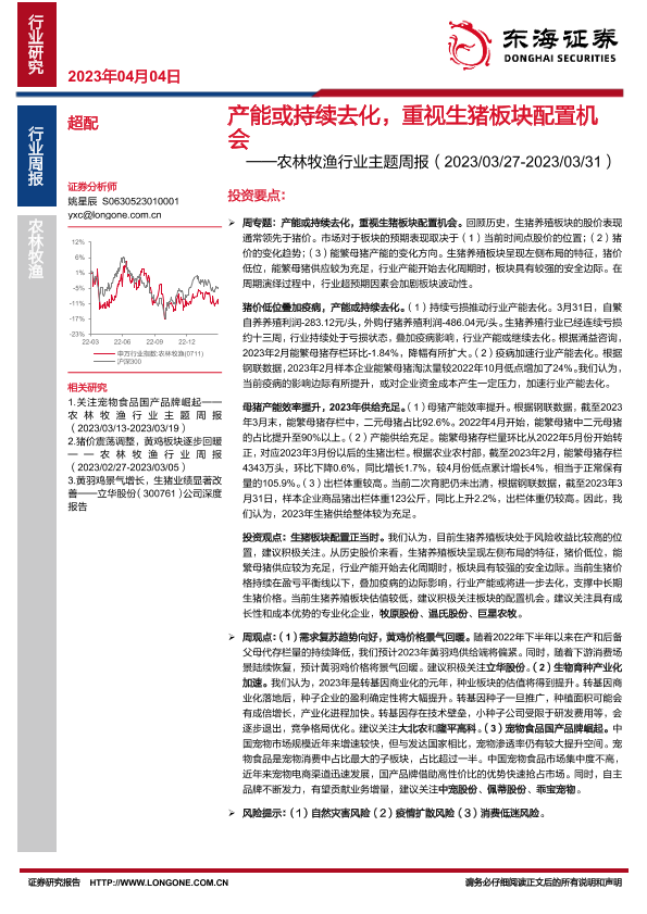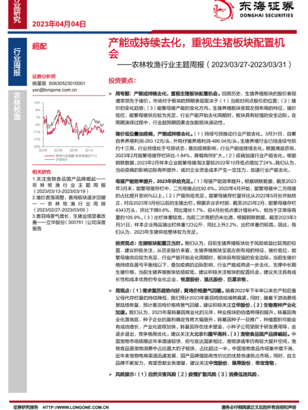 【东海证券】【20230404】20230404-东海证券-农林牧渔行业主题周报:产能或持续去化,重视生猪板块配置机会-16页