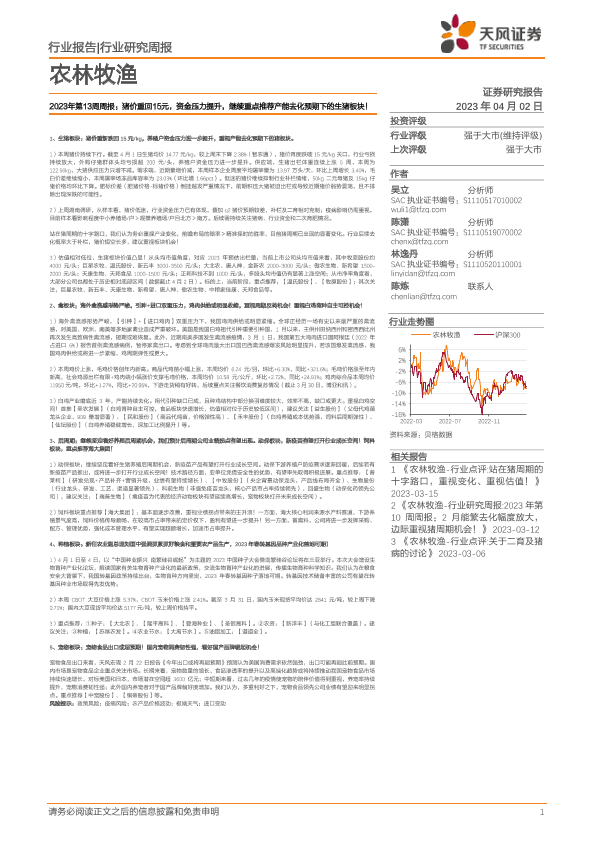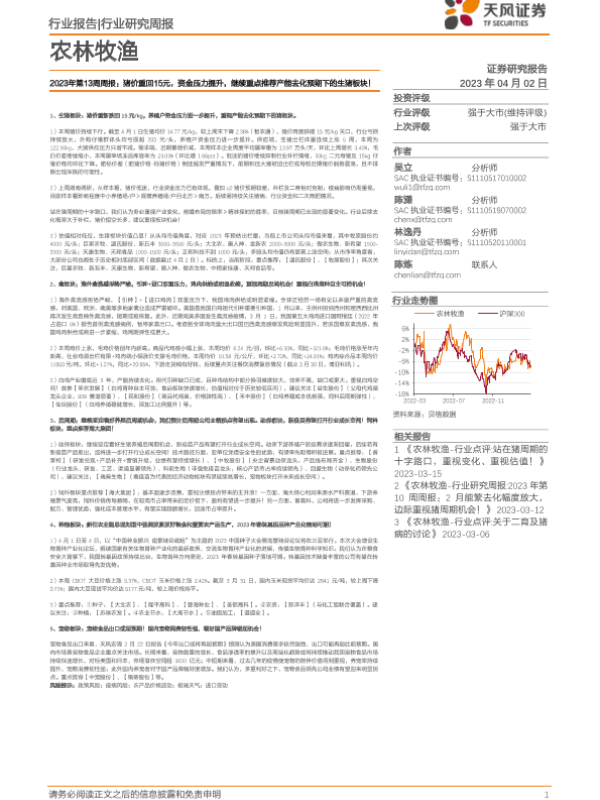 【天风证券】【20230402】农林牧渔行业2023年第13周周报:猪价重回15元,资金压力提升,继续重点推荐产能去化预期下的生猪板块!-14页
