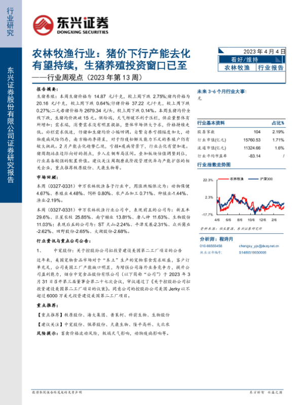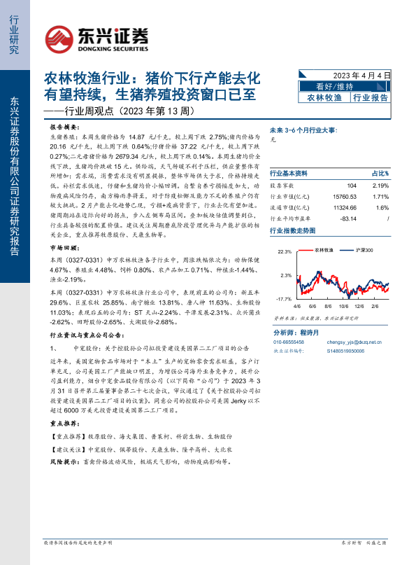 【东兴证券】【20230404】农林牧渔行业:猪价下行产能去化有望持续,生猪养殖投资窗口已至-12页