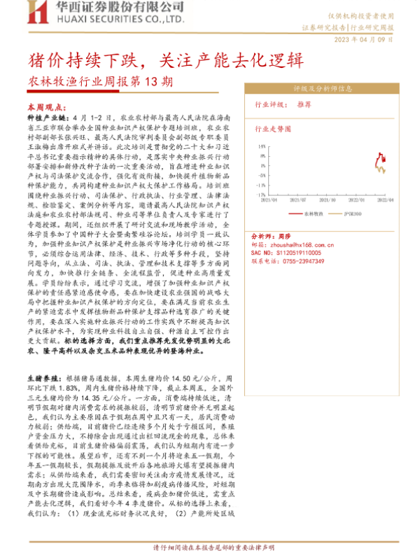 【华西证券】【20230409】20230409-华西证券-农林牧渔行业周报第13期:猪价持续下跌,关注产能去化逻辑-25页