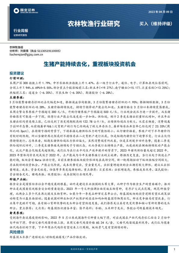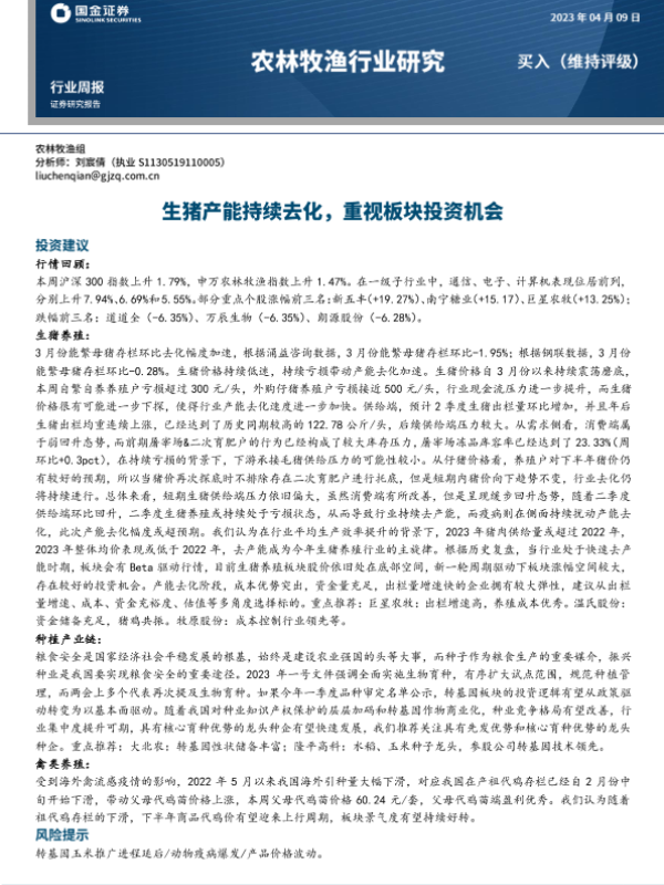 【国金证券】【20230409】20230409-国金证券-农林牧渔行业研究:生猪产能持续去化,重视板块投资机会-15页