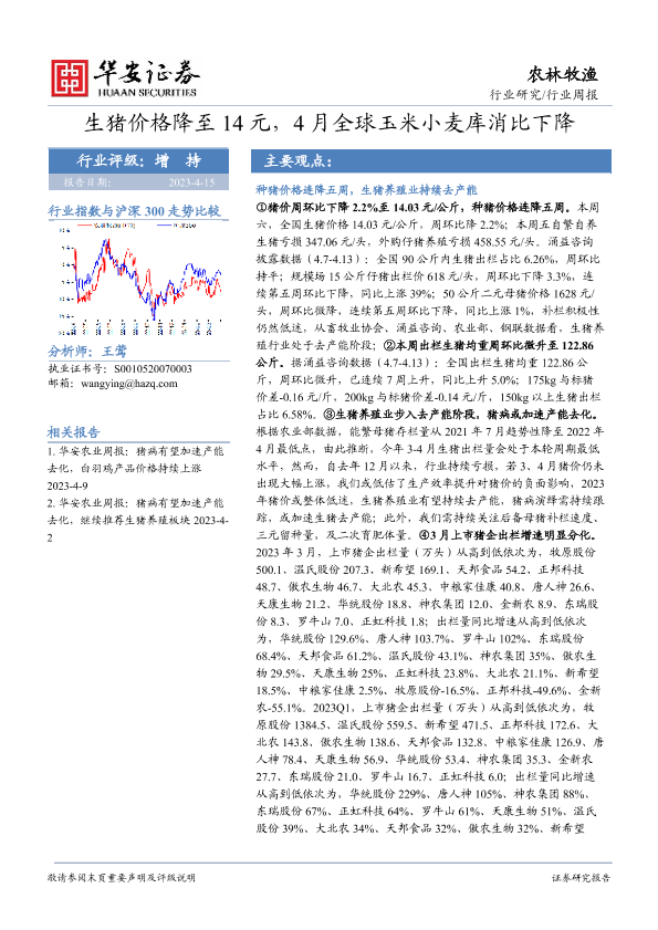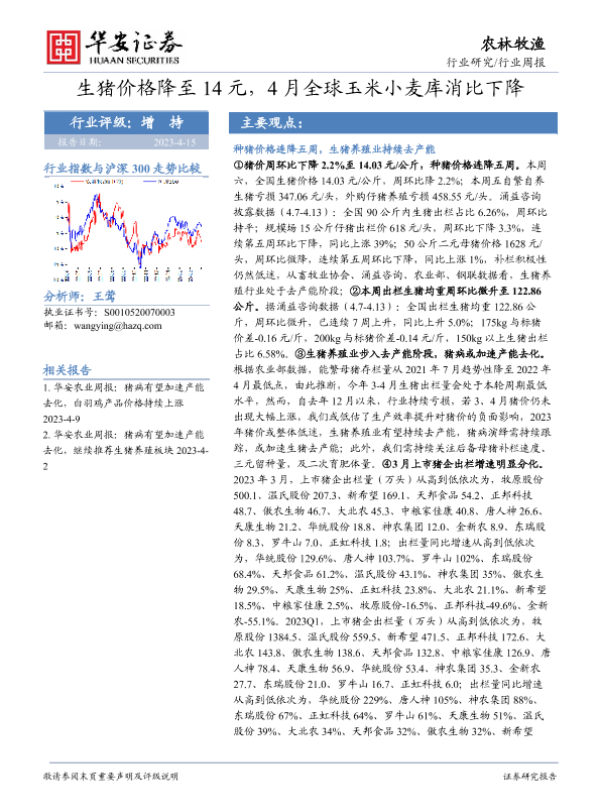 【华安证券】【20230415】20230415-华安证券-农林牧渔行业周报:生猪价格降至14元,4月全球玉米小麦库消比下降-44页