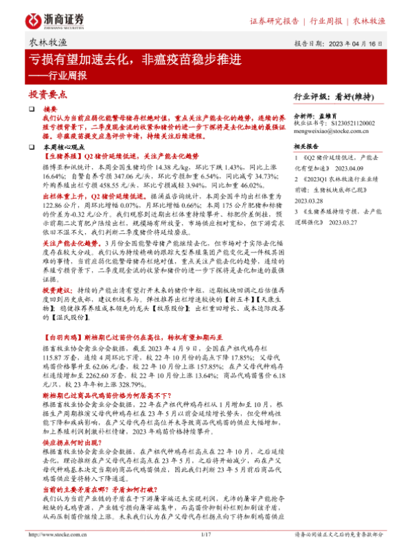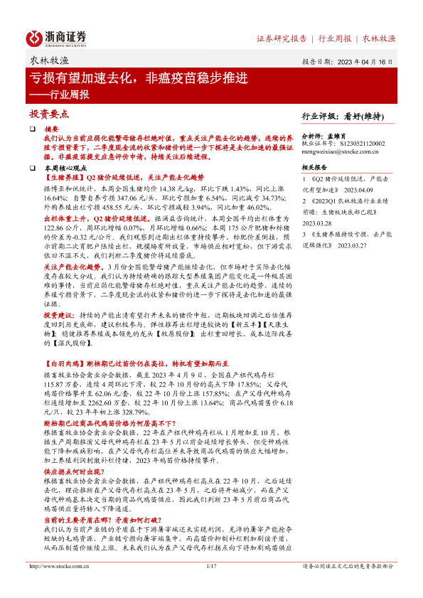 【浙商证券】【20230416】20230416-浙商证券-农林牧渔行业周报:亏损有望加速去化,非瘟疫苗稳步推进-17页