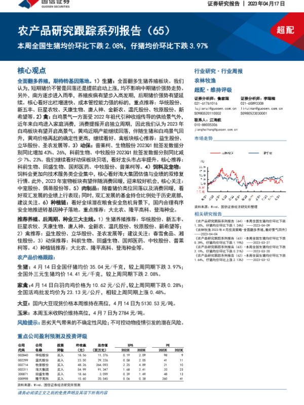 【国信证券】【20230417】20230417-国信证券-农产品研究跟踪系列报告(65):本周全国生猪均价环比下跌2.08%,仔猪均价环比下跌3.97%-21页