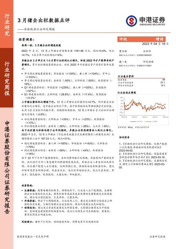 【申港证券】【20230416】20230416-申港证券-农林牧渔行业研究周报:3月猪企出栏数据点评-13页
