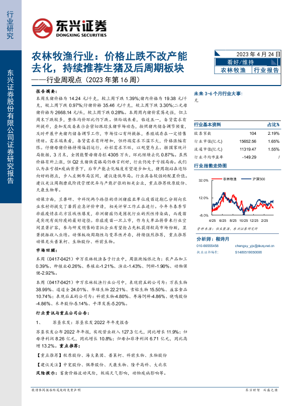 【东兴证券】【20230424】农林牧渔行业:价格止跌不改产能去化,持续推荐生猪及后周期板块-13页