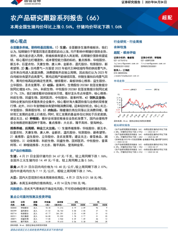 【国信证券】【20230424】20230424-国信证券-农产品研究跟踪系列报告(66):本周全国生猪均价环比上涨0.56%,仔猪均价环比下跌1.06%-21页