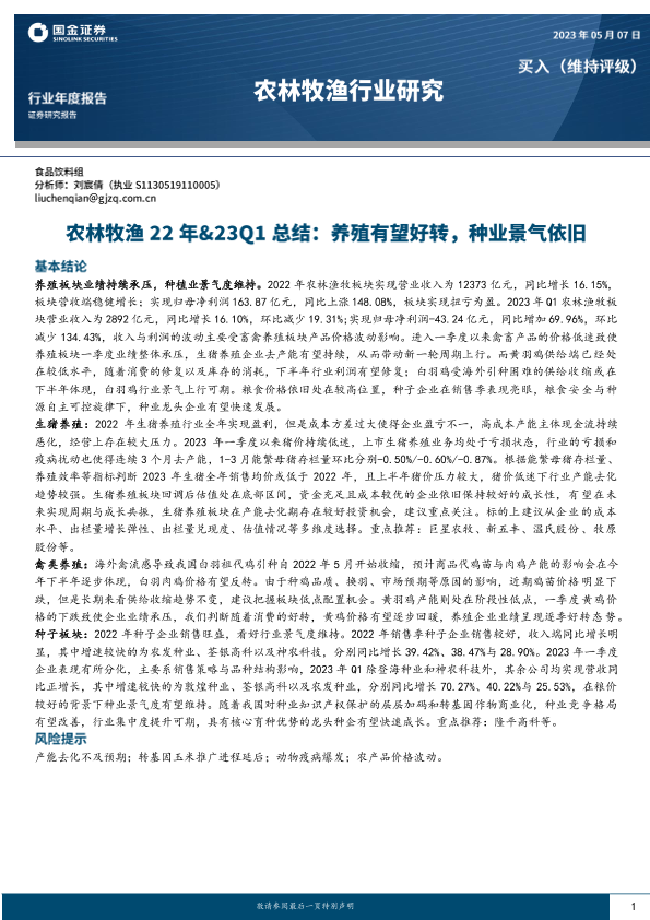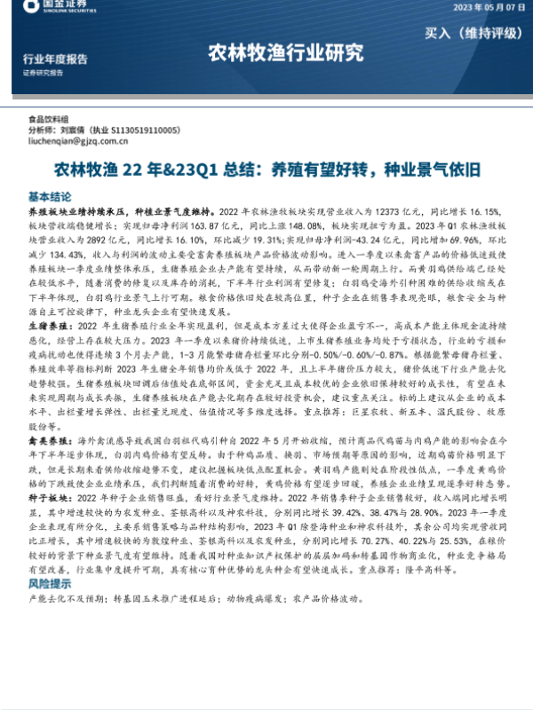 【国金证券】【20230507】农林牧渔行业22年&23Q1总结:养殖有望好转,种业景气依旧-18页