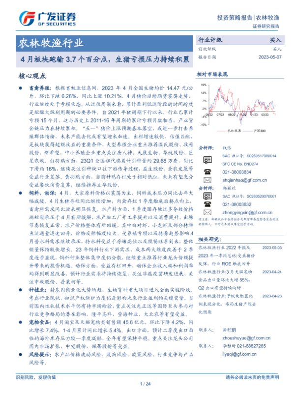 【广发证券】【20230507】20230507-广发证券-农林牧渔行业投资策略报告:4月板块跑输3.7个百分点,生猪亏损压力持续积累-24页