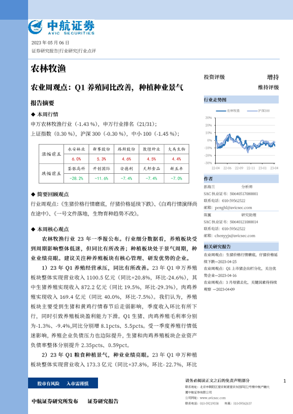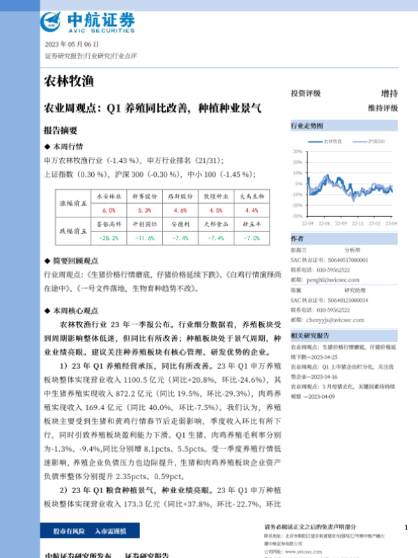 【中航证券】【20230506】农业周观点:Q1养殖同比改善,种植种业景气-15页