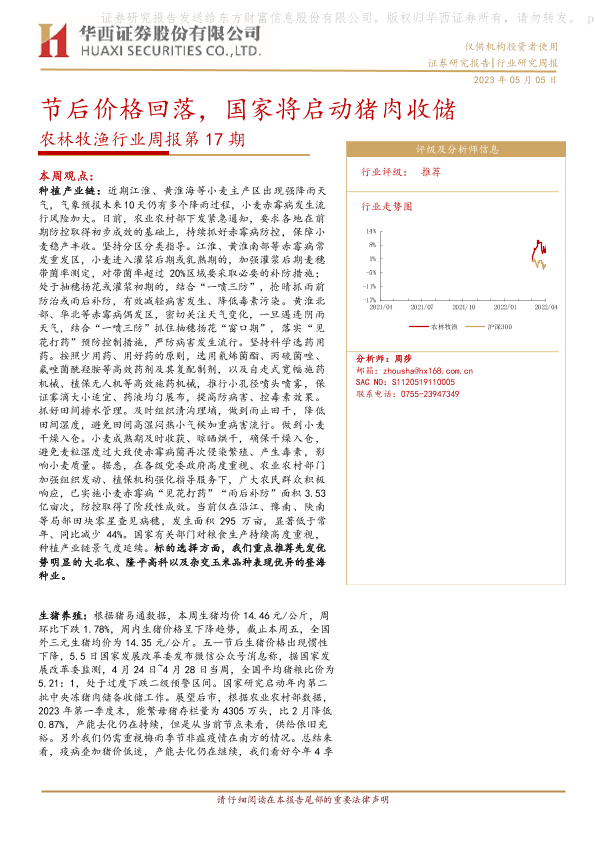 【华西证券】【20230505】20230505-华西证券-农林牧渔行业周报第17期:节后价格回落,国家将启动猪肉收储-26页