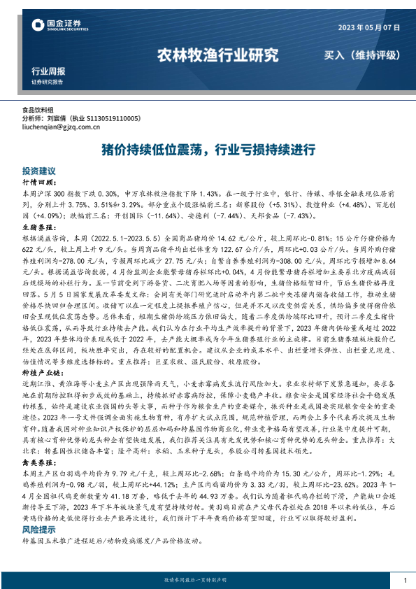 【国金证券】【20230507】20230507-国金证券-农林牧渔行业研究:猪价持续低位震荡,行业亏损持续进行-15页