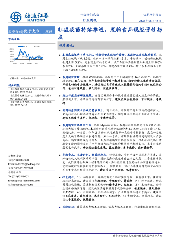 【海通证券】【20230514】20230514-海通证券-农业行业周报:非瘟疫苗持续推进,宠物食品现经营性拐点-10页
