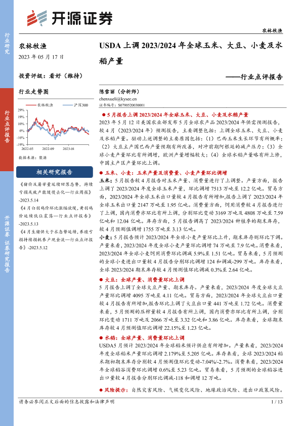 【开源证券】【20230517】20230517-开源证券-农林牧渔行业点评报告:USDA上调2023 2024年全球玉米、大豆、小麦及水稻产量-13页