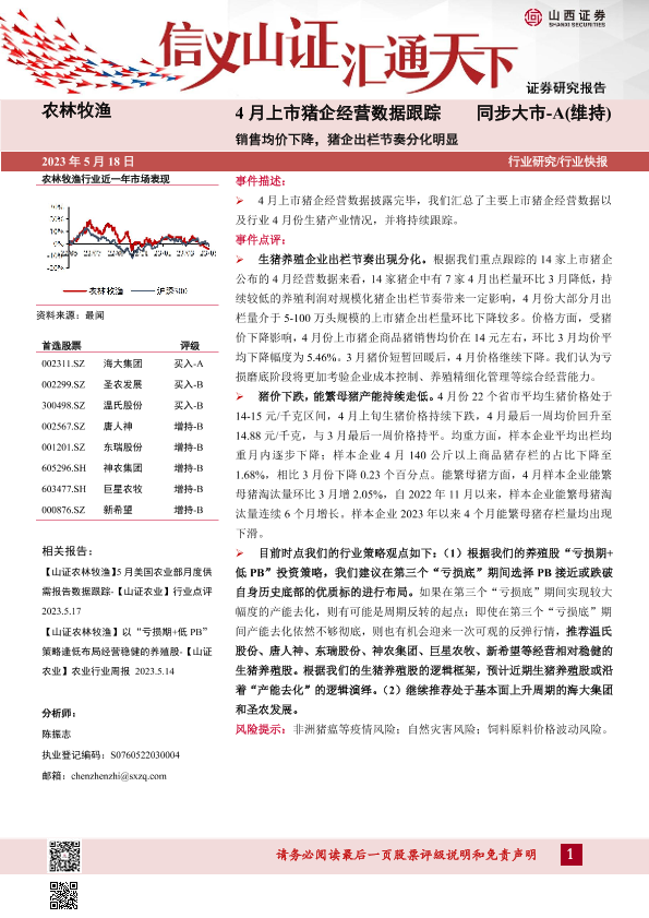 【山西证券】【20230518】4月上市猪企经营数据跟踪:销售均价下降,猪企出栏节奏分化明显-13页