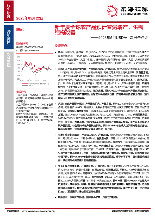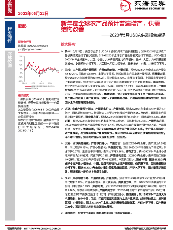 【东海证券】【20230522】2023年5月USDA供需报告点评-新年度全球农产品预计普遍增产,供需结构改善-10页