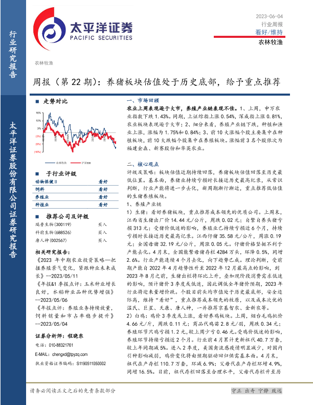 【太平洋证券】【20230604】20230604-太平洋-农林牧渔行业周报(第22期):养猪板块估值处于历史底部,给予重点推荐-18页