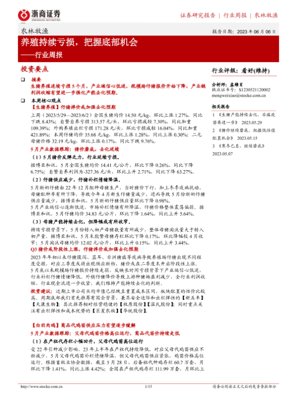 【浙商证券】【20230606】20230606-浙商证券-农林牧渔行业周报:养殖持续亏损,把握底部机会-15页