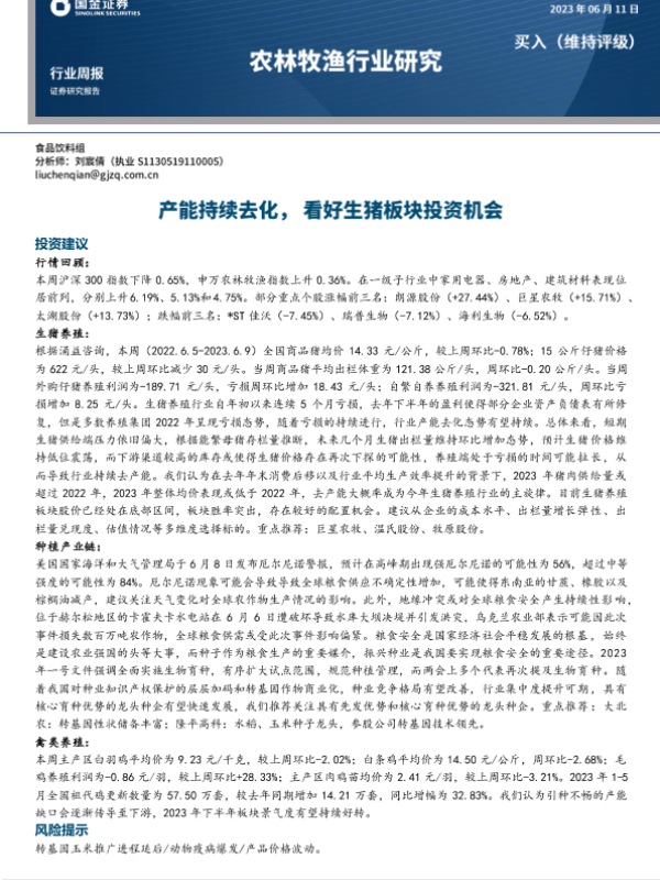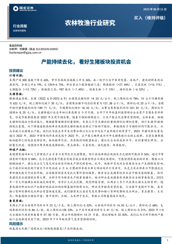 【国金证券】【20230611】20230611-国金证券-农林牧渔行业研究:产能持续去化,看好生猪板块投资机会-17页