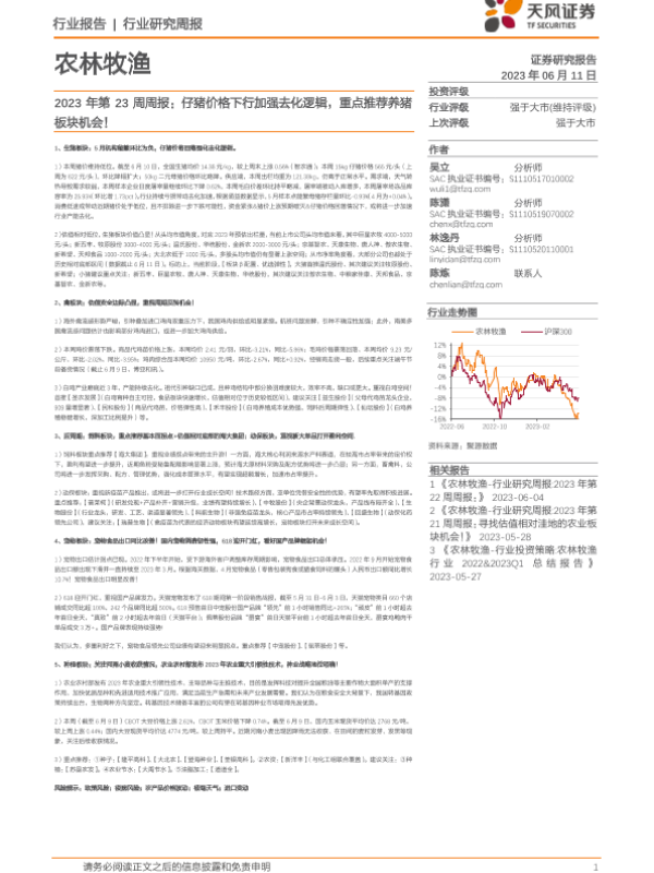 【天风证券】【20230611】农林牧渔2023年第23周周报:仔猪价格下行加强去化逻辑,重点推荐养猪板块机会!-14页