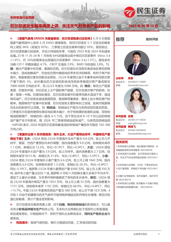 【民生证券】【20230614】20230614-民生证券-农林牧渔行业周报:厄尔尼诺发生概率再度上调,关注天气对各农产品的影响-10页