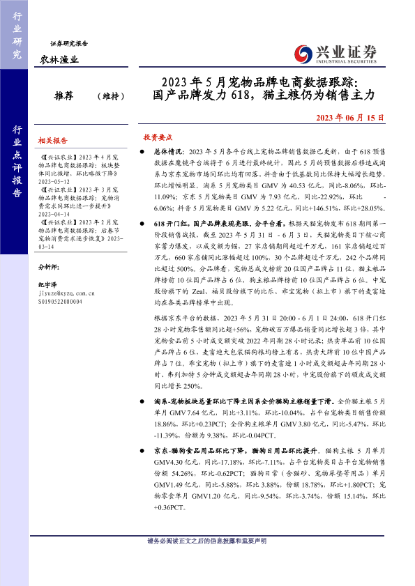 【兴业证券】【20230615】2023年5月宠物品牌电商数据跟踪:国产品牌发力618,猫主粮仍为销售主力-10页