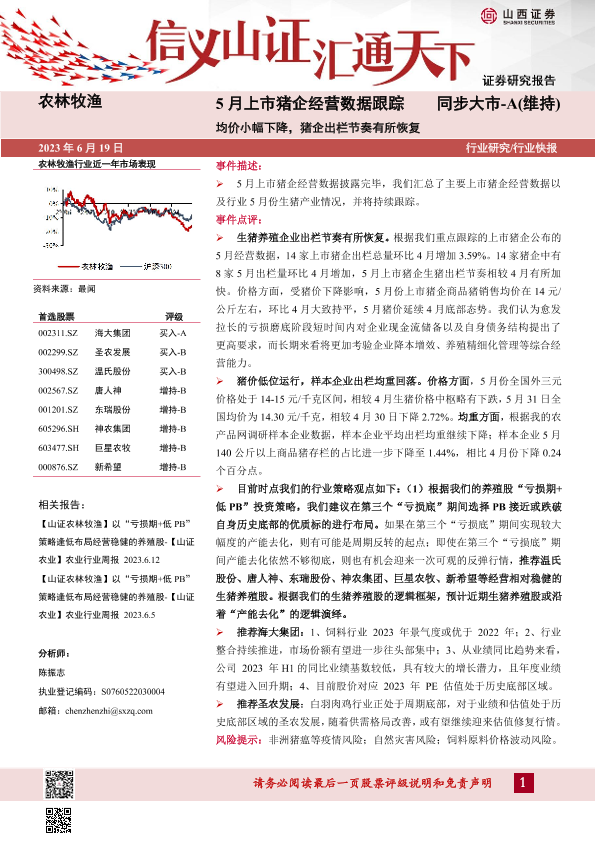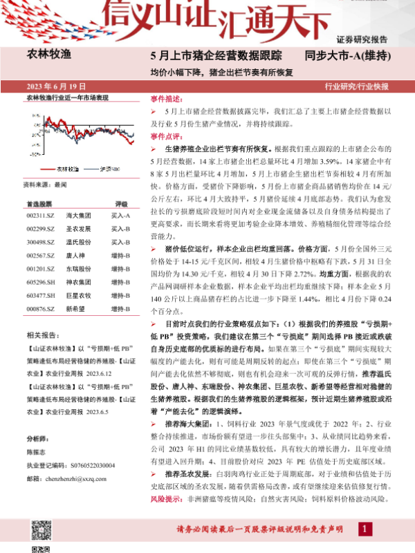 【山西证券】【20230619】5月上市猪企经营数据跟踪:均价小幅下降,猪企出栏节奏有所恢复-13页