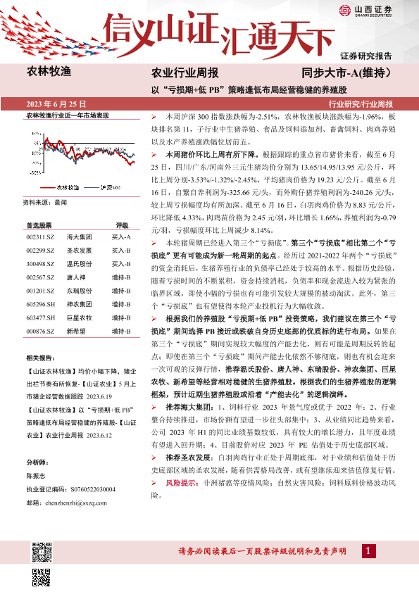 【山西证券】【20230625】农业行业周报:以“亏损期+低PB”策略逢低布局经营稳健的养殖股-19页