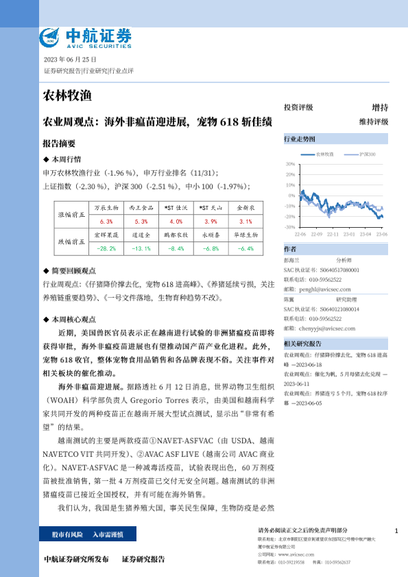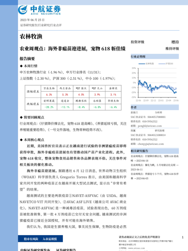 【中航证券】【20230625】农林牧渔农业周观点:海外非瘟苗迎进展,宠物618斩佳绩-14页