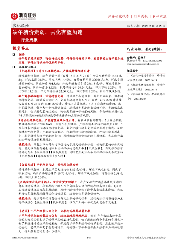 【浙商证券】【20230625】20230625-浙商证券-农林牧渔行业周报:端午猪价走弱,去化有望加速-16页