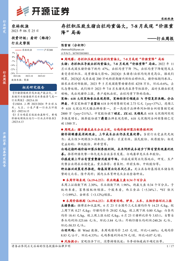 【开源证券】【20230625】20230625-开源证券-农林牧渔行业周报:存栏积压致生猪出栏均重偏大,7-8月或现“价涨重降”局面-17页