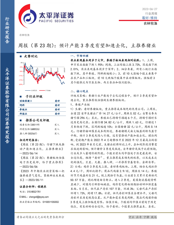 【太平洋证券】【20230627】20230627-太平洋-农林牧渔行业周报(第23期):预计产能3季度有望加速去化,主推养猪业-16页