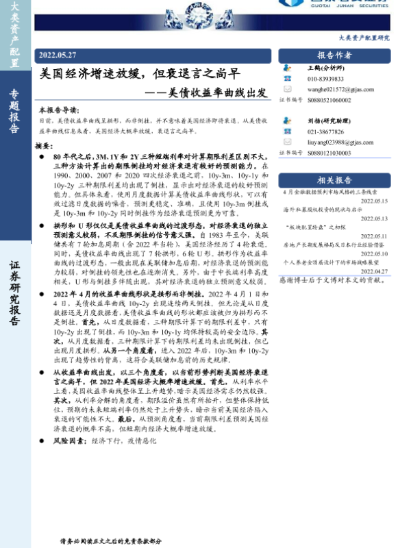【国泰君安证券】【20220527】美债收益率曲线出发:美国经济增速放缓,但衰退言之尚早-20页