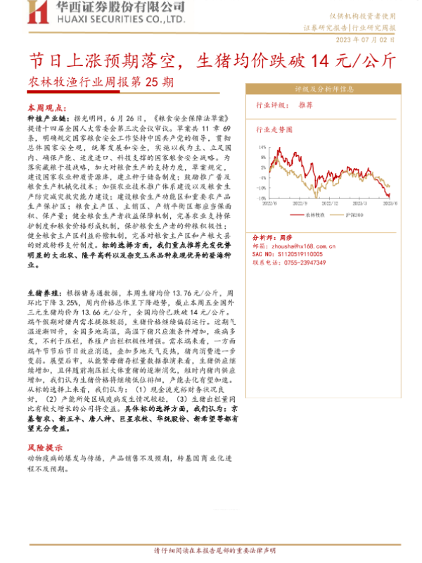 【华西证券】【20230702】农林牧渔行业周报第25期:节日上涨预期落空,生猪均价跌破14元/公斤-25页