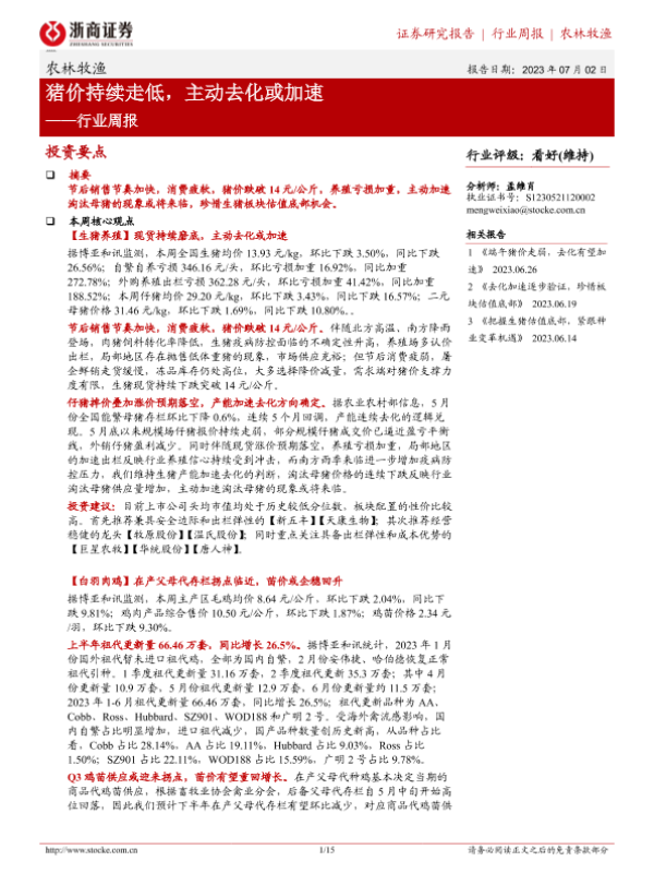 【浙商证券】【20230702】20230703-浙商证券-农林牧渔行业周报:猪价持续走低,主动去化或加速-15页