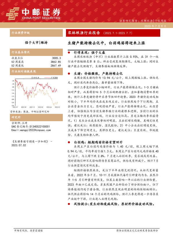【中邮证券】【20230709】20230709-中邮证券-农林牧渔行业报告:生猪产能持续去化中,白羽鸡苗将迎来上涨-13页