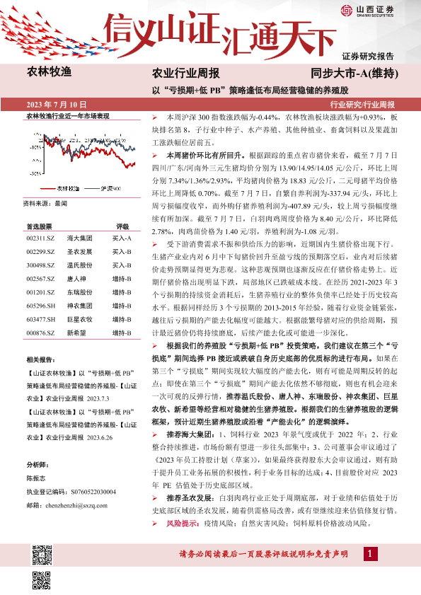 【山西证券】【20230710】农业行业周报:以“亏损期+低PB”策略逢低布局经营稳健的养殖股-19页