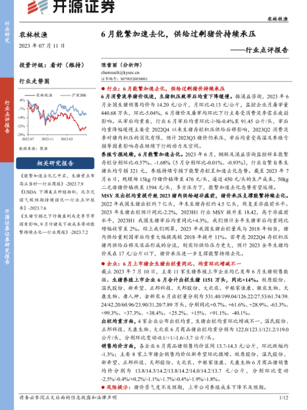 【开源证券】【20230711】20230711-开源证券-农林牧渔行业点评报告:6月能繁加速去化,供给过剩猪价持续承压-12页