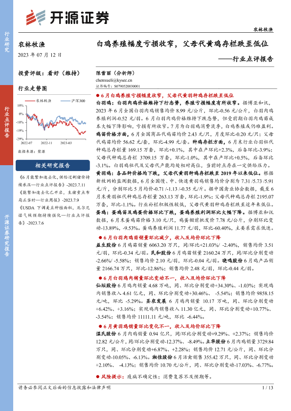 【开源证券】【20230712】20230712-开源证券-农林牧渔行业点评报告:白鸡养殖幅度亏损收窄,父母代黄鸡存栏跌至低位-13页