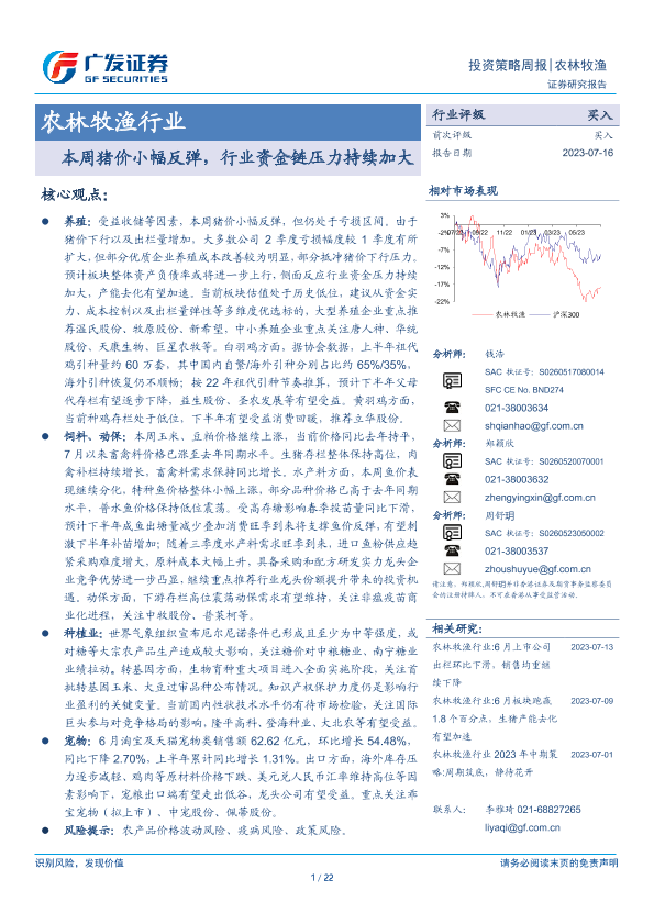 【广发证券】【20230716】20230716-广发证券-农林牧渔行业投资策略周报:本周猪价小幅反弹,行业资金链压力持续加大-22页