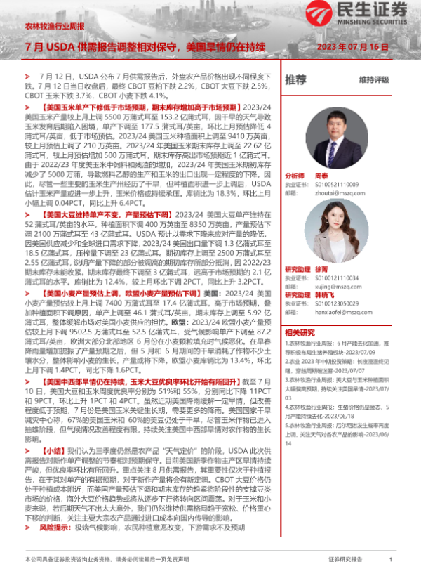 【民生证券】【20230716】农林牧渔行业周报:7月USDA供需报告调整相对保守,美国旱情仍在持续-10页
