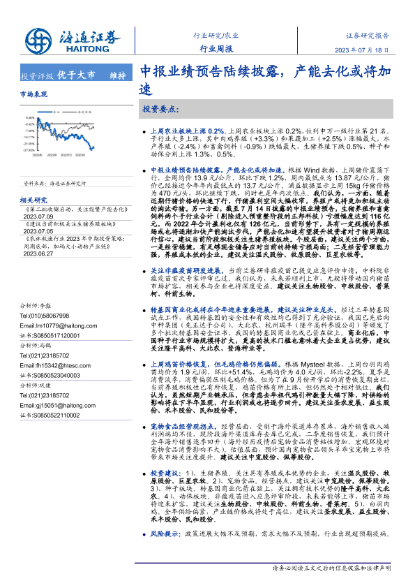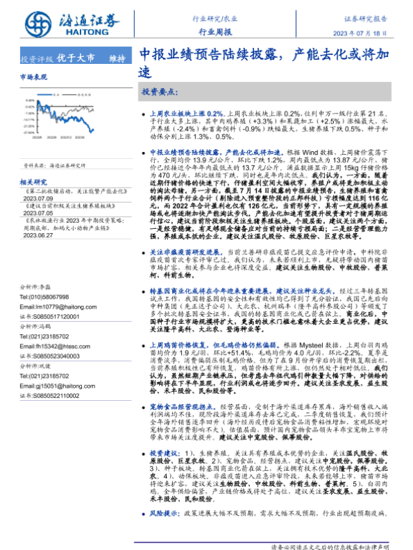 【海通证券】【20230718】20230718-海通证券-农业行业周报:中报业绩预告陆续披露,产能去化或将加速-10页