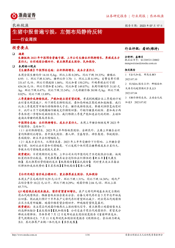 【浙商证券】【20230717】20230717-浙商证券-农林牧渔行业周报:生猪中报普遍亏损,左侧布局静待反转-16页