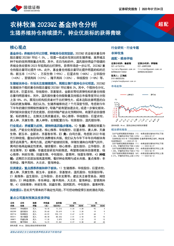 【国信证券】【20230724】2023Q2基金持仓分析:生猪养殖持仓持续提升,种业优质标的获得青睐-27页