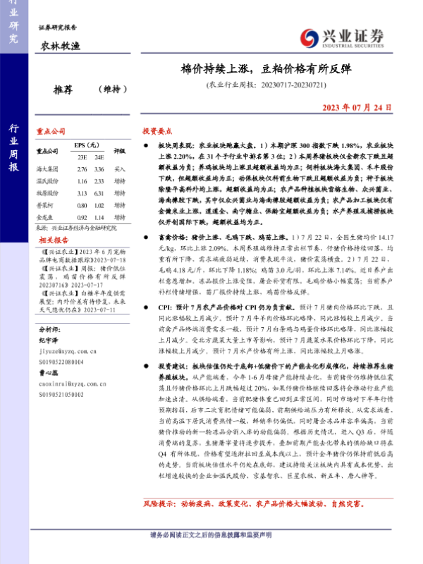 【兴业证券】【20230724】20230724-兴业证券-农业行业周报:棉价持续上涨,豆粕价格有所反弹-16页