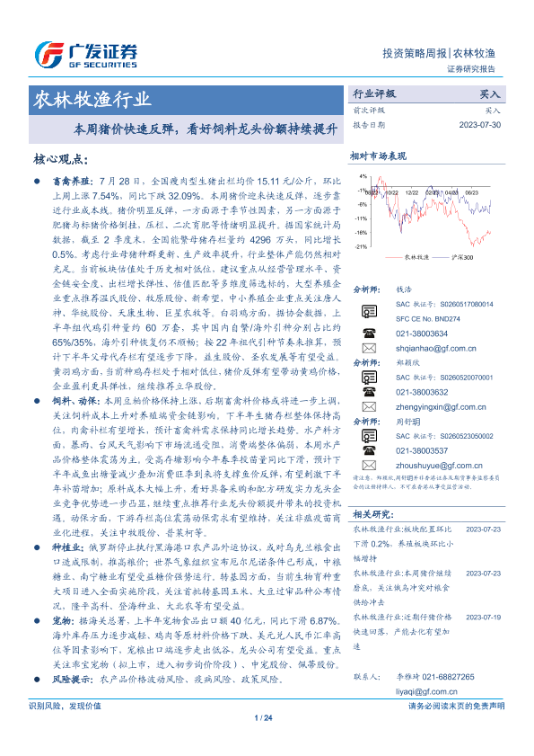 【广发证券】【20230730】20230730-广发证券-农林牧渔行业投资策略周报:本周猪价快速反弹,看好饲料龙头份额持续提升-24页